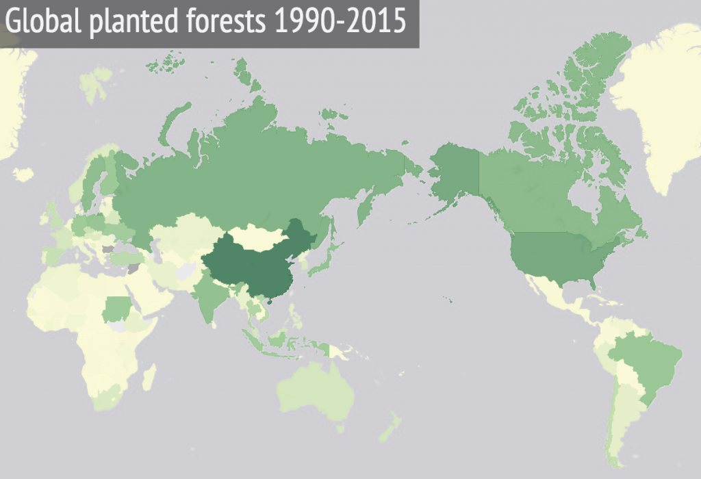 Afforestation is happening around the world: see the Carbon Brief’s mapping of it from 1990 – 2015.